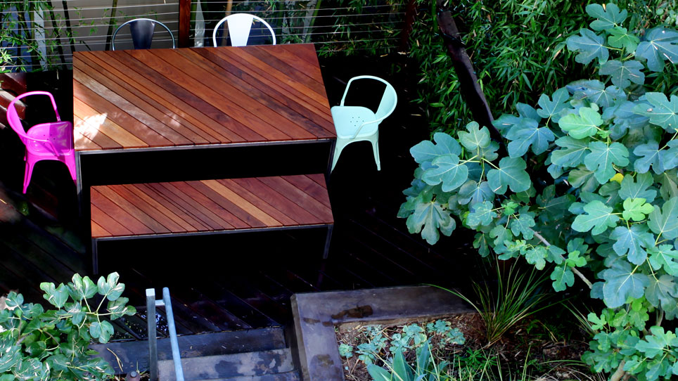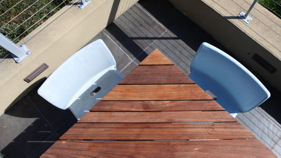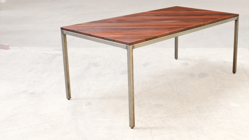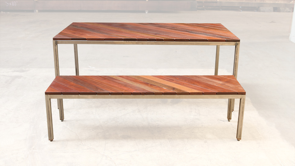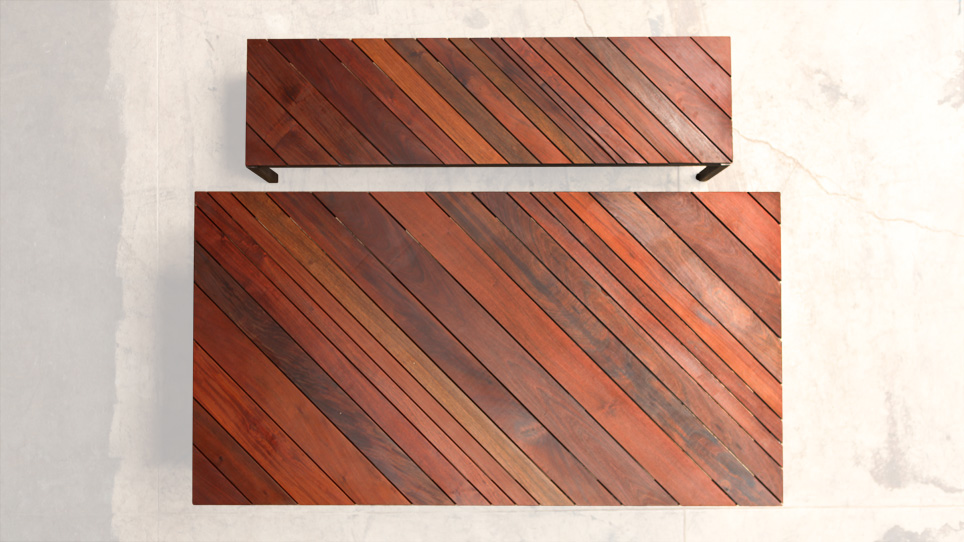 In an attempt to extend the work I've been doing with angling board glue-ups, I decided to take a stab at an outdoor line. Building outdoor furniture has a lot of added complexities that indoor furniture does not, so numerous things had to be taken into mind when attempting this. Because of this, I chose to use Ipe which is great for outdoor use, as well as beautiful looking. I attached the slats at a 45° angle, varying the slat width from skinny to fat and back. I hope you like the outcome. Available as a large table, small table and large bench.
