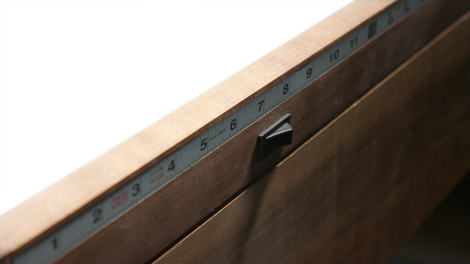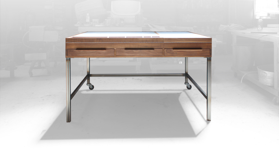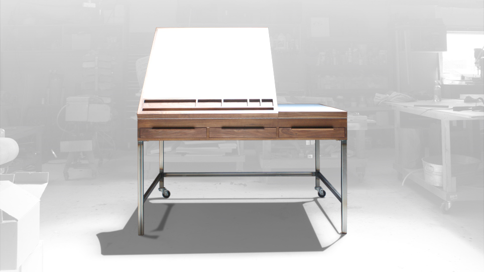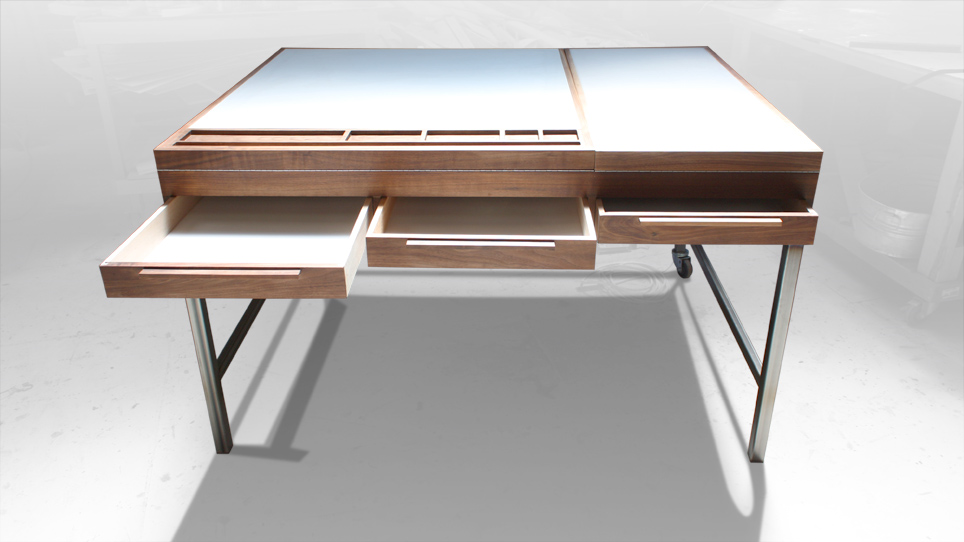 A fashion designer friend of mine approached me about making her a worktable/desk. She needed something she could do multiple things on... sketch, cut fabric, trace patterns and so on. To incorporate all of these needs, I included a drawing surface on the left that raises up and a light box on the right. Underneath are 3 drawers that open from either side and along the side is a tape measure for her fabric. The table is very sturdy but can easily be moved around by most anyone using the two casters. Although a complex table in it's abilities, I was happy with the simple, clean shape.